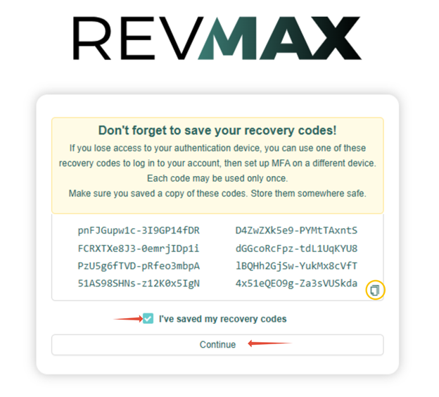 3. Make sure to save your recovery codes and then click "Continue.” This will bring you to the next step, which is to add your new personal password.